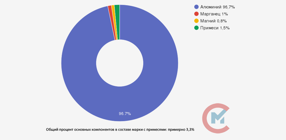 В данный сплав входят такие элементы, как магний (0,8-1,3 %), марганец (1-1,5 %), кремний, железо (0,7 %), а также титан, цинк и медь (0,1 %). Благодаря небольшому количеству магния и марганца в составе, сплав обладает отличительной структурой и стойкостью к коррозии.