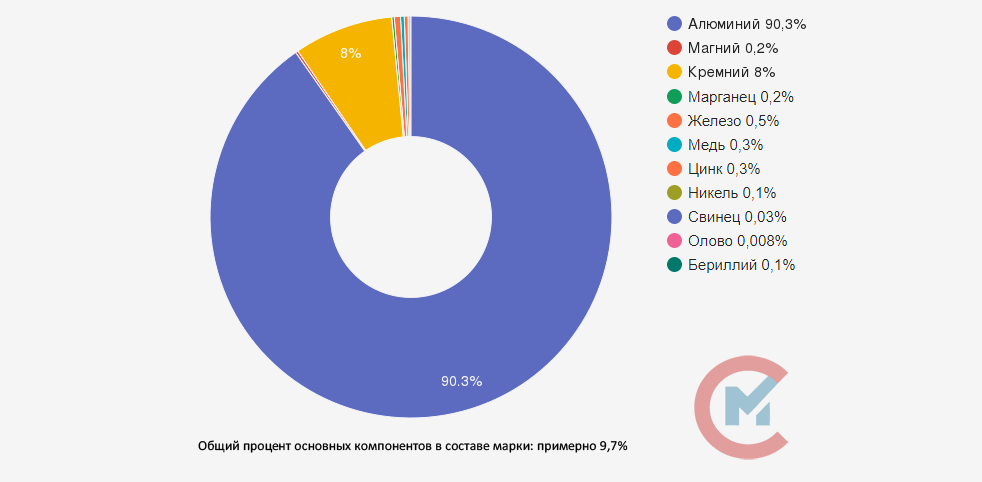 АЛ4 относится к категории силумина. Материал должен содержать в своем составе приблизительно 8-10% кремния, 0,2-0,5% магния и примеси в пределах 1,5%.