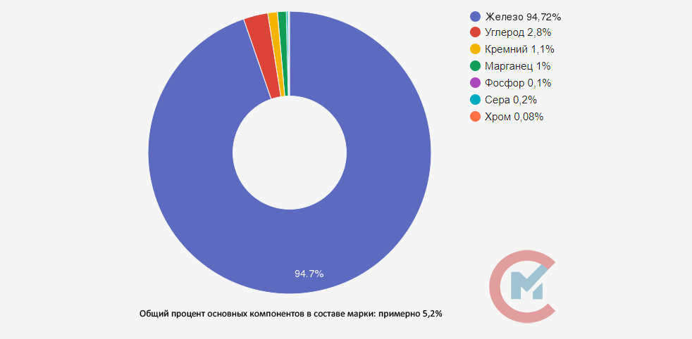 Данный сплав содержит в себе углерод в виде хлопьевидного графита, представленного крупными включениями в структуру чугуна. Следующими по уменьшению процентного значения элементами в сплаве является кремний и марганец. Они помогают графитизации и общему качеству материала.