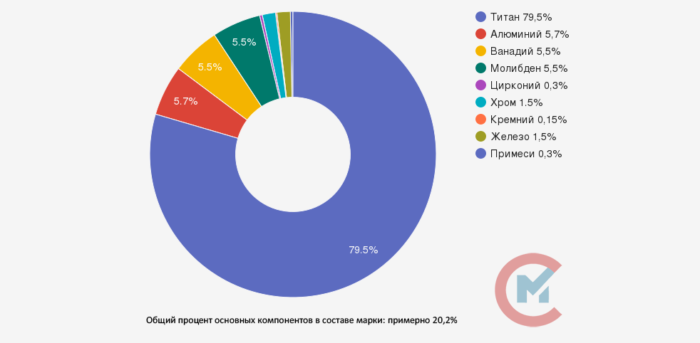 В основном сплав состоит из титана (Ti) в процентном соотношении от 78,485% до 86,6%. Суммарное содержание примесей в сплаве до 0,3%: железо (Fe) от 0,5% до 1,5%, углерод (C) до 0,1%, кремний (Si) до 0,15%, хром (Cr) от 0,5% до 2%, молибден (Mo) от 4% до 5,5%, ванадий (V) от 4% до 5,5%, азот (N) до 0,05%, алюминий (Al) от 4,4% до 5,9%, цирконий (Zr) до 0,3%, кислород (O) до 0,2%, водород (H) до 0,015%.